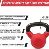 Each kettlebell is comprised of solid cast iron with a hammertone non-chip finish. Our kettlebell has a coating at the base to cut back on noise, chipping, and accidents.